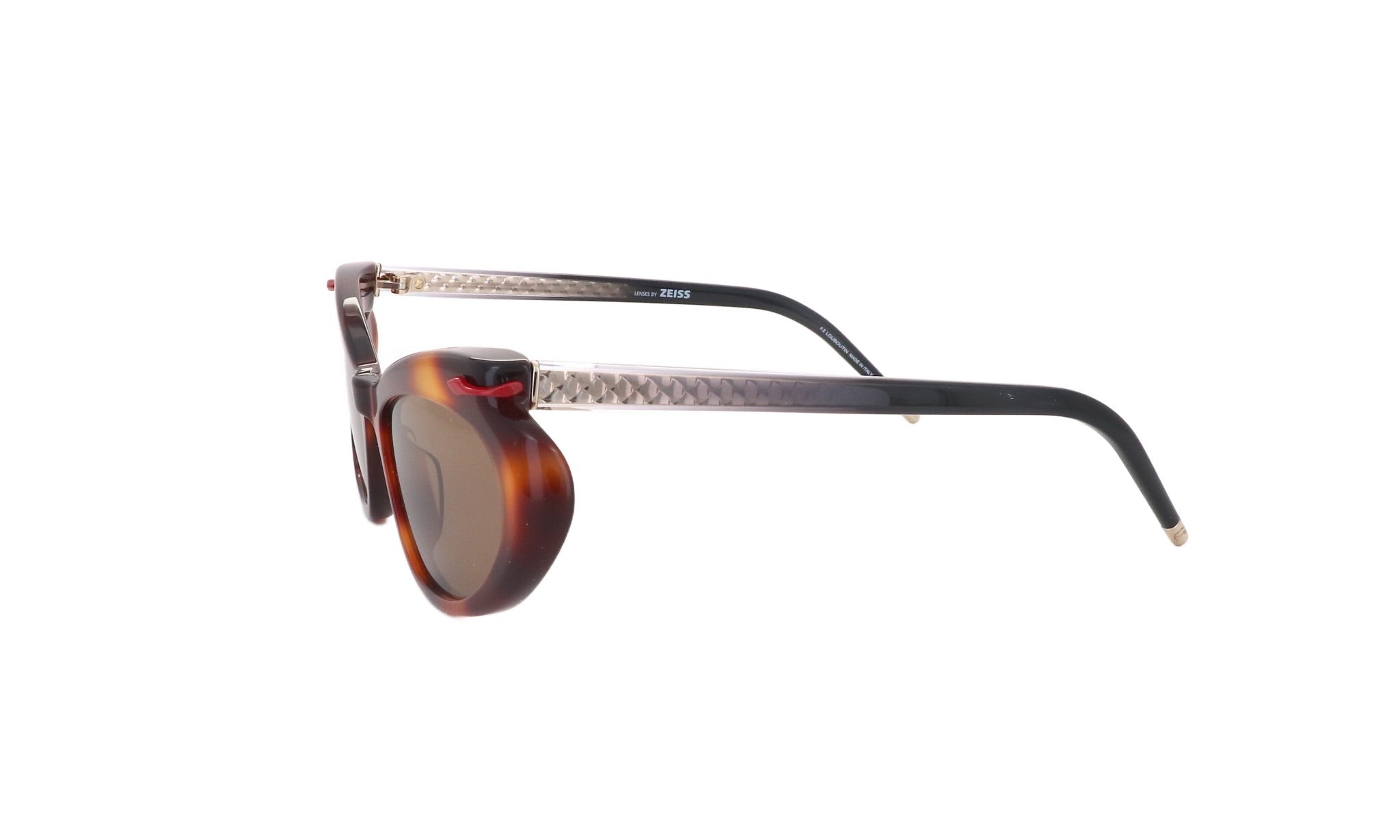 Meticulosamente elaborados a partir de acetatos personalizados desenvolvidos exclusivamente para Christian Louboutin, cada par de óculos de sol apresenta elementos icónicos como a paleta de cores vermelha e preta exclusiva, bem como o padrão palmeta, inspirado na arquitetura das boutiques.