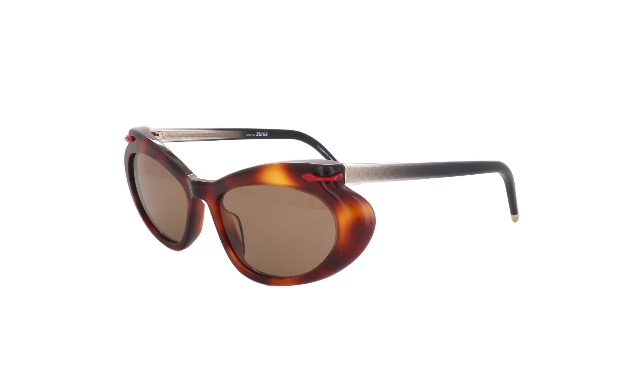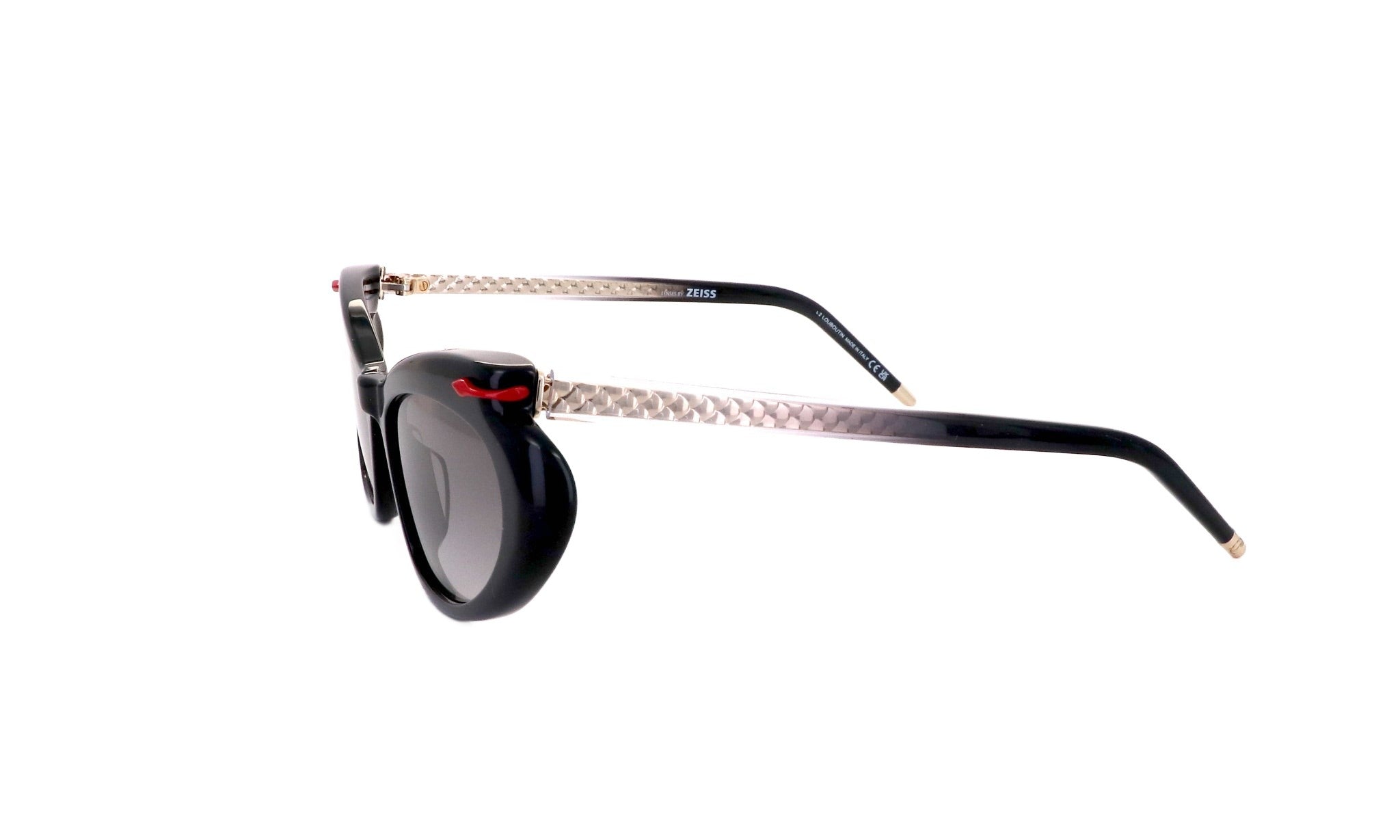 Os óculos têm lentes Zeiss de alto desempenho, garantindo qualidade, conforto e durabilidade excecionais. Com revestimentos antirreflexo e acabamentos personalizados em vermelho esfumado ou vermelho quente, as lentes combinam estilo com função, oferecendo proteção visual.